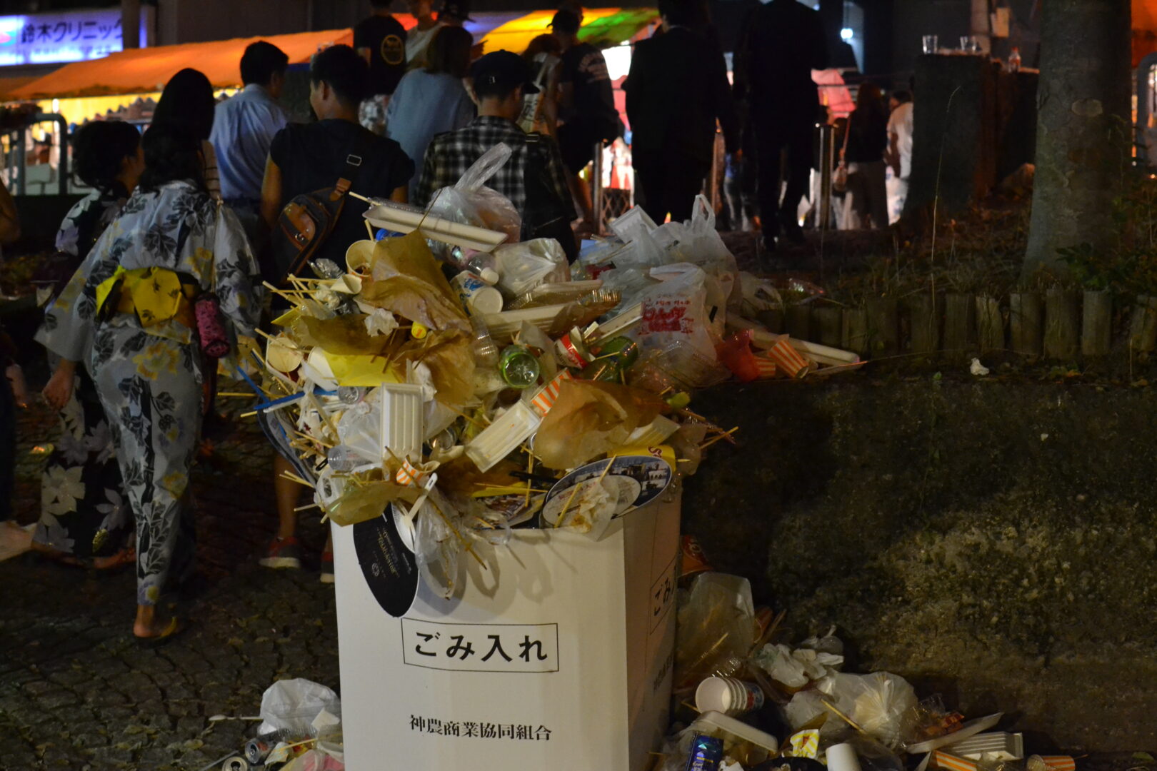 2016年の調査では天神祭の期間に発生するごみは2日間でデータが得られるだけでも60トン、実際にはこれをさらに相当上回るものと思われます。また、その量の多さだけではなく道や広場に広がる散乱ごみの状況も深刻で、回収されたごみも適切な分別がなされないためにほとんどが焼却処分されていました。